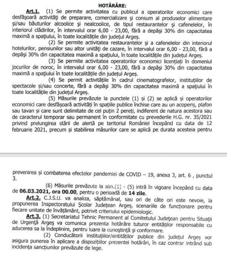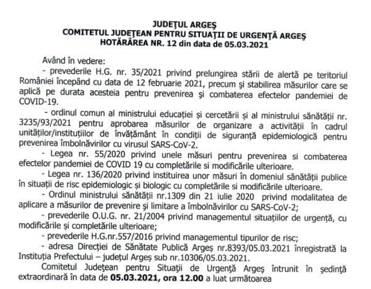 CJSU a prelungit cu 14 zile restricțiile pentru întreg Argeșul, pe fondul pandemiei de COVID-19. Hotărârea de prelungire intră în vigoare mâine, 6 martie 2021, la ora 00:00 (la noapte).