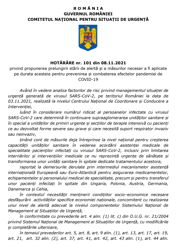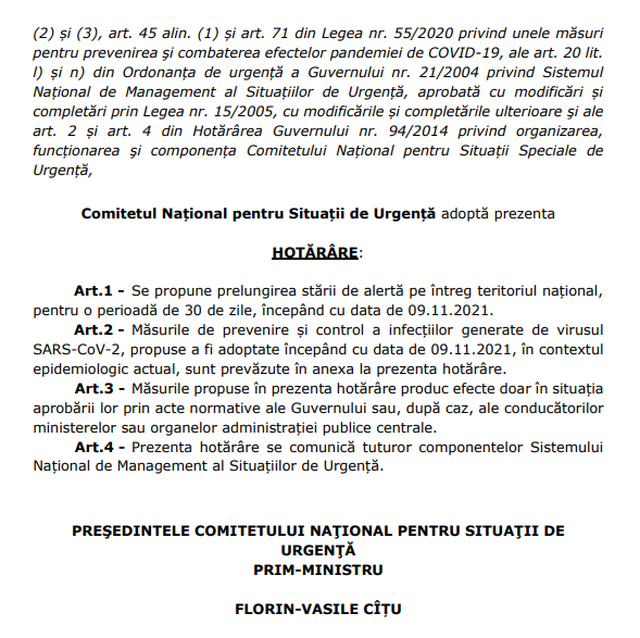Comitetul Național pentru Situații de Urgență (CNSU) a hotărât astăzi să propună prelungirea cu încă 30 de zile a stării de alertă. Măsura va intra în vigoare pe 9 noiembrie 2021.