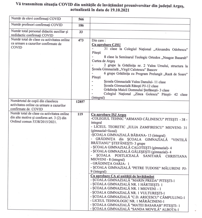 Amintim că mai multe unități de învățământ au trecut cu totul în online, ca urmare a faptului că 50% dintre clase/grupe aveau activitatea întreruptă din cauza COVID-19. Printre acestea se numără și colegiile naționale „Alexandru Odobescu” și „Zinca Golescu” din Pitești.