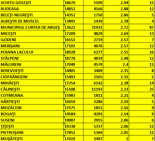 Printre localitățile aflate în scenariul galben se numără municipiul Curtea de Argeș și comunele Budeasa, Micești, Merișani și Pietroșani: