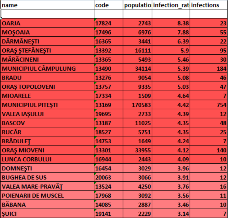În scenariul roșu de câteva zile, municipiul Pitești a depășit pragul de 4 cazuri de infectare la mia de locuitori, ajungând la 4,42, de la 3,77 în urmă cu 24 de ore.