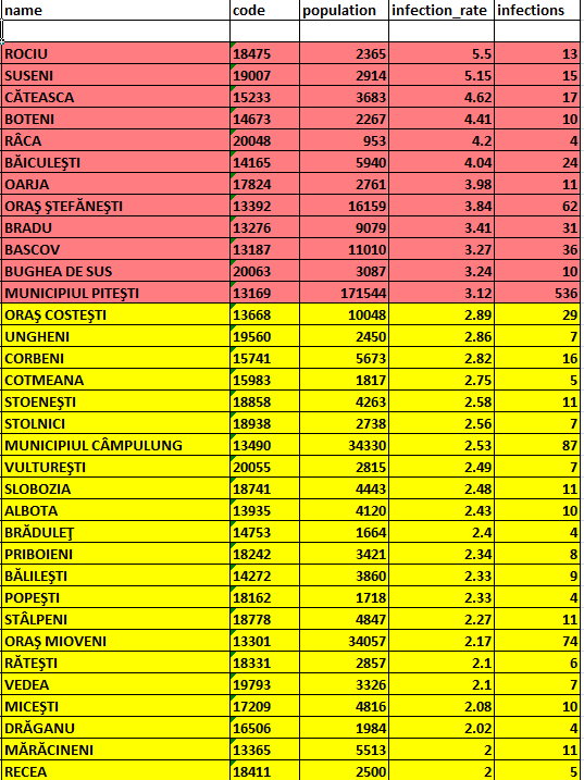 Localitățile din Argeș cu cele mai mari rate de incidență a cazurilor de infectare cu noul coronavirus, potrivit Direcției de Sănătate Publică: