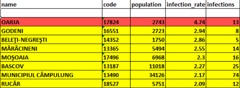 Alte 7 localități se află în scenariul galben, cu rată de infectare peste 2 la 1.000 de locuitori: comunele Godeni, Beleți-Negrești, Mărăcineni, Moșoaia, Bascov și Rucăr și municipiul Câmpulung.
