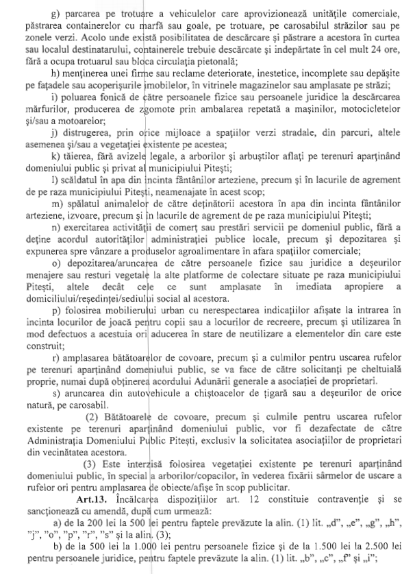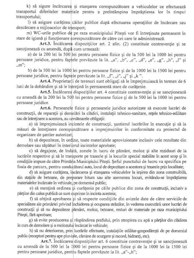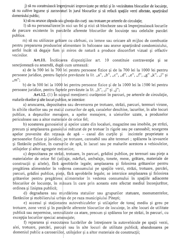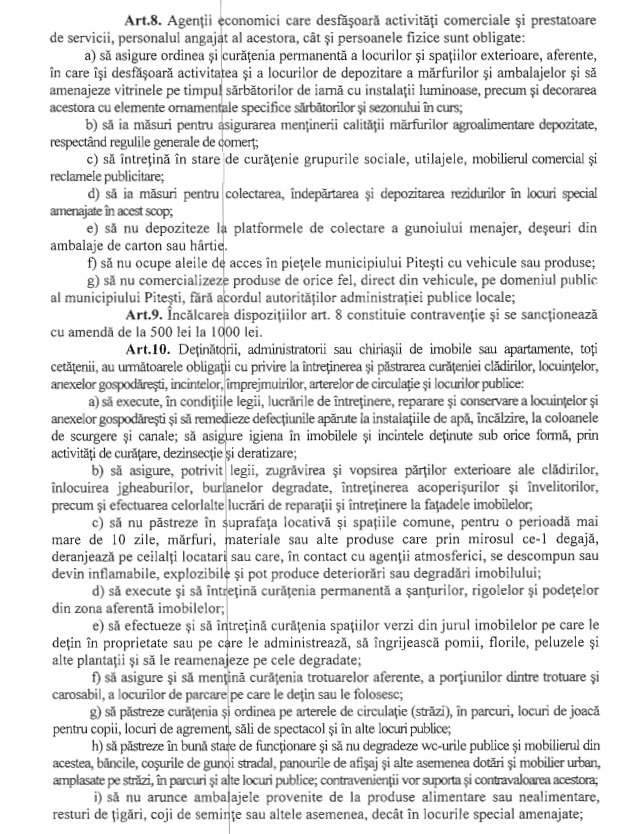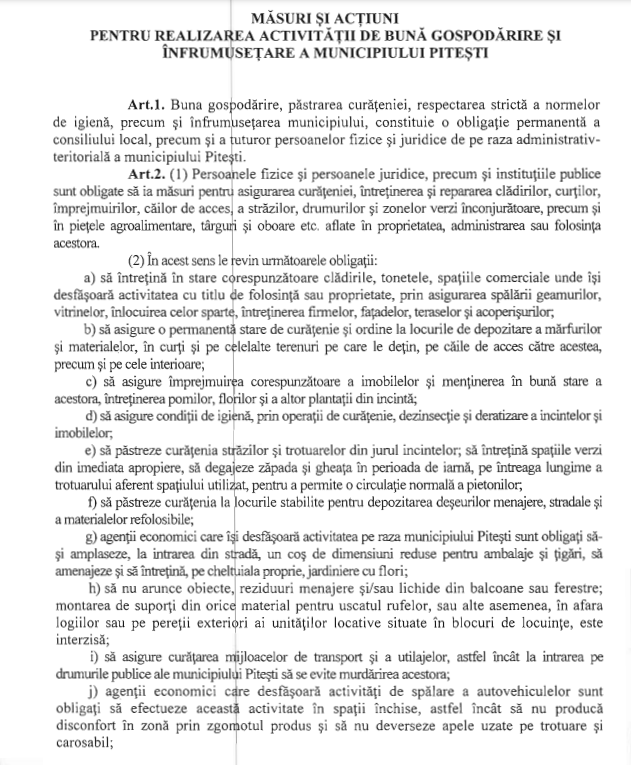 Primăria Pitești a adunat laolaltă reguli vechi și reguli noi și propune un proiect cu „măsuri și acțiuni pentru realizarea activității de bună gospodărire și înfrumusețare a municipiului”. Probabil încă un proiect inutil: nu puține dintre regulile deja existente nu au fost niciodată respectate și nici Primăria nu s-a arătat interesată să vegheze la respectarea lor.