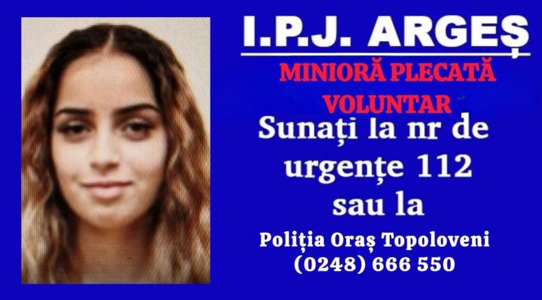 Persoanele care pot da relații cu privire la minoră sunt rugate să apeleze Serviciul Național Unic Apeluri de Urgență 112 sau Poliția Orașului Topoloveni, la numărul de telefon 0248.666.550”.