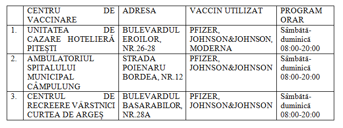 Reamintim, însă, că în weekendul care vine piteștenii se vor putea vaccina și la Colegiul „I.C. Brătianu” (aici amănunte). De asemenea, a fost extins în weekend și programul centrului de vaccinare de la Policlinica Spitalului Militar (aici detalii).