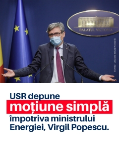 USR îi cere imperativ demisia ministrului Energiei, Virgil Popescu (PNL), din cauza incapacității sale de a-i ajuta pe români să traverseze cu bine perioada exploziei prețurilor la energie. În cazul în care nu va demisiona, USR va depune în Parlament o moțiune simplă împotriva ministrului Popescu.