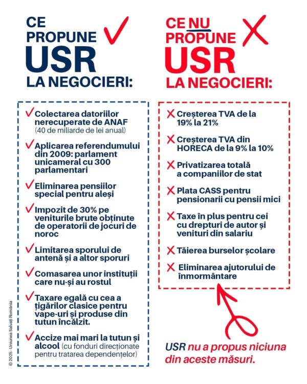 ”Zvonuri, informații ”pe surse” și știri false circulă în toate direcțiile zilele acestea despre ce propune USR la negocierile pentru formarea Guvernului. Ți le-am pus pe toate la un loc, ca sa știi ce e adevărat și ce e fals.