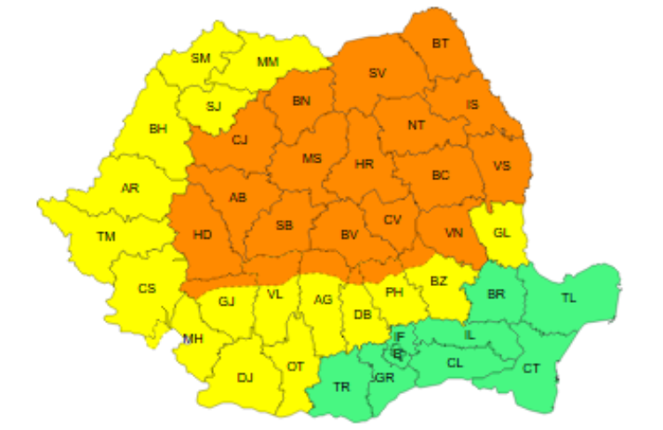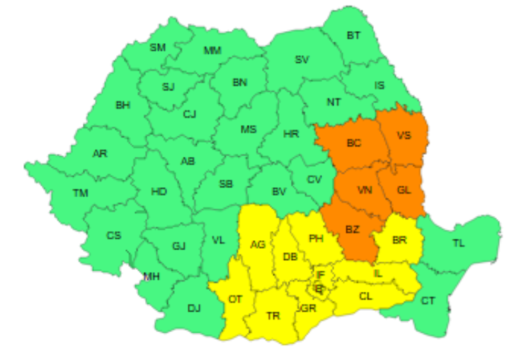 În jumătatea sudică a Moldovei și nord-estul Munteniei vor fi vijelii (viteze ale vântului de 70…90 km/h), grindină de medii și mari dimensiuni, frecvente descărcări electrice și ploi torențiale.