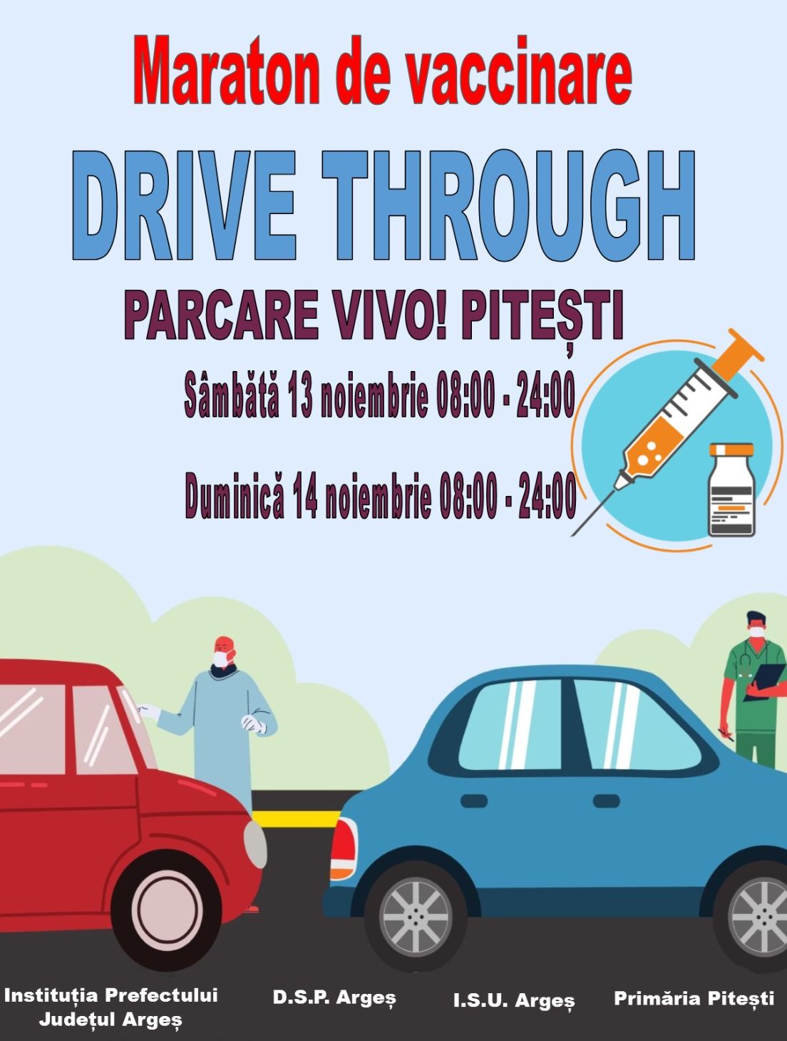 În premieră pentru județul Argeș, în Pitești va avea loc în weekend un maraton de vaccinare drive-through. Sâmbătă, 13 noiembrie, și duminică, 14 noiembrie, între orele 08:00-24:00, cei care vor să se vaccineze fără a coborî din autoturism vor găsi echipe medicale în parcarea centrului comercial Vivo!