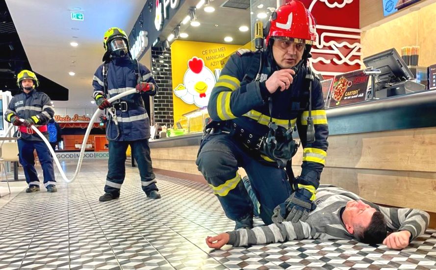 Conform scenariului, salvatorii au fost anunțați de izbucnirea unui incendiu. La sosirea acestora, incendiul se manifesta în zona sectorului comercial, la etajul 1 al clădirii, ca urmare a lăsării nesupravegheate a unei plite de gătit electrice, fiind afectată o suprafață de 150 de mp. Totodată, flăcările prezentau pericol mare de propagare la întregul etaj.