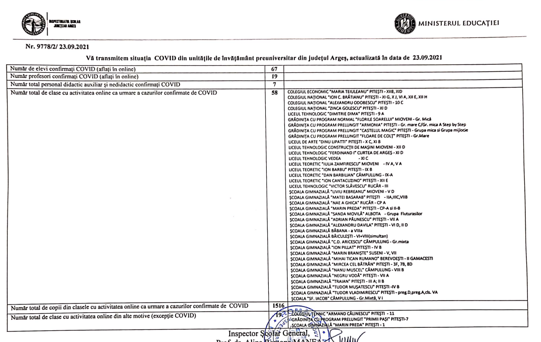 Situația actualizată pentru joi, 23 septembrie, ne-a fost transmisă de Inspectoratul Școlar cu puțin timp în urmă. Pe listă apare în premieră și Colegiul Național „Zinca Golescu” din Pitești, cu o clasă a XI-a a cărei activitate a trecut în online: