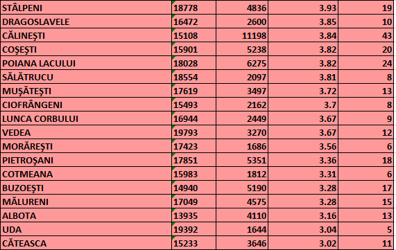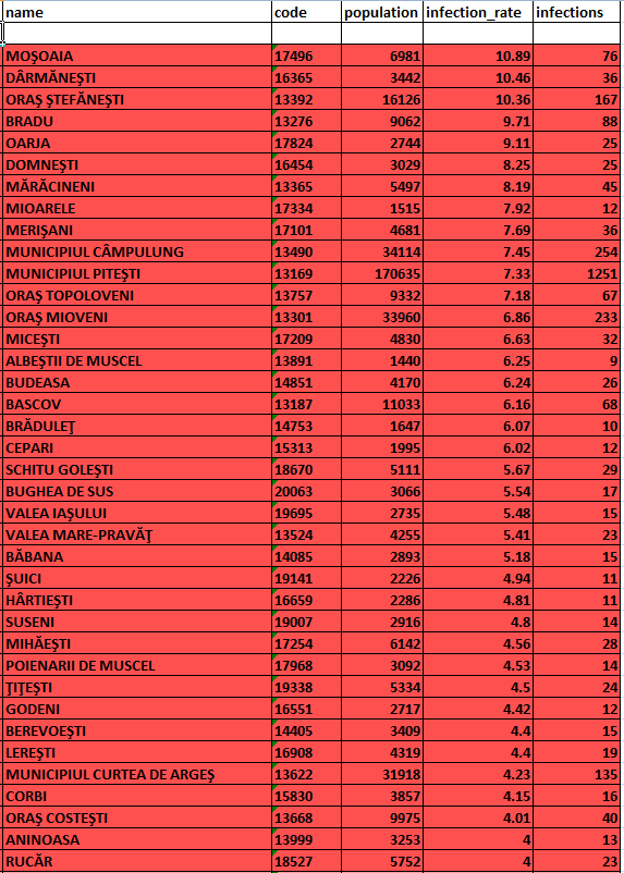 Localitățile din județul Argeș care sunt în scenariul roșu din punct de vedere epidemiologic (situația la zi, 26 ianuarie 2022):