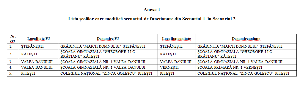 5 unități de învățământ din județul Argeș, printre care și Colegiul Național „Zinca Golescu” din Pitești, trec în Scenariul 2 din punct de vedere epidemiologic. Cursurile se vor desfășura exclusiv online (click pe imagine pentru vizualizare):