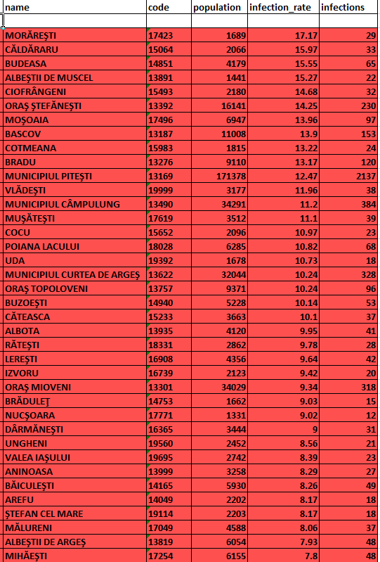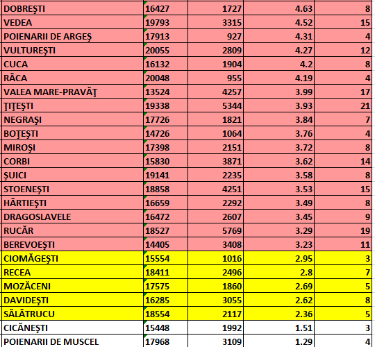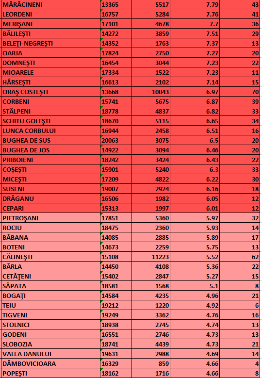Scăderi în ultimele 24 de ore sunt și în alte localități argeșene aflate în topul infectărilor, ca de exemplu orașul Ștefănești și comunele Morărești, Ciofrângeni, Moșoaia, Bascov și Bradu.
